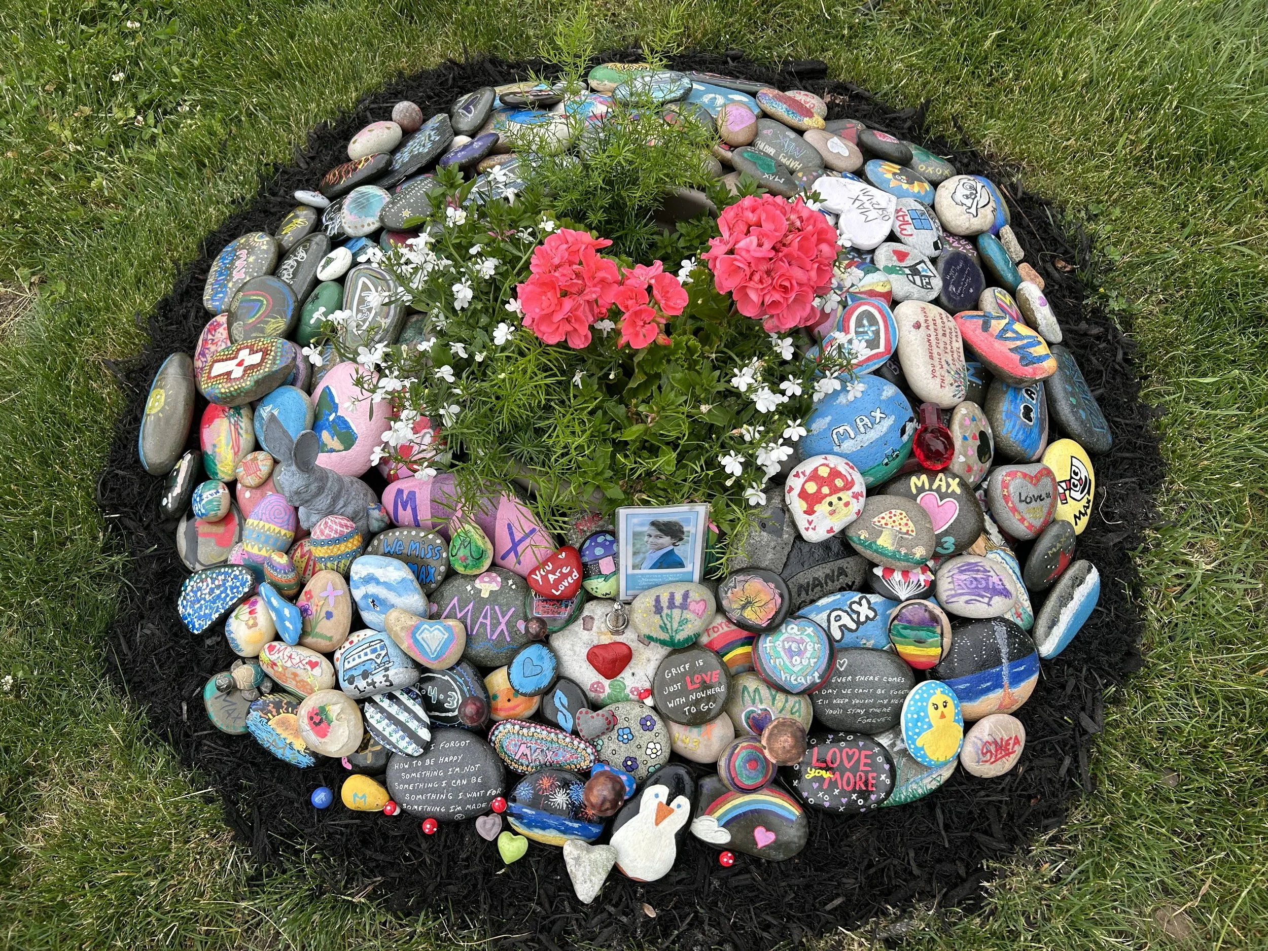 Among other things, Maximus loved to paint rocks. It was yet another way he would bring color and joy into the world. In his memory, a beautiful memorial has formed where he lies. An ever-growing collection of painted rocks from friends and family the world over. It is an amazing symbol of love and a great source of strength for our family. Most importantly, it is something we know would bring a coy smile to his beautiful face.